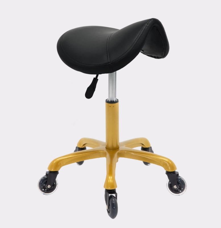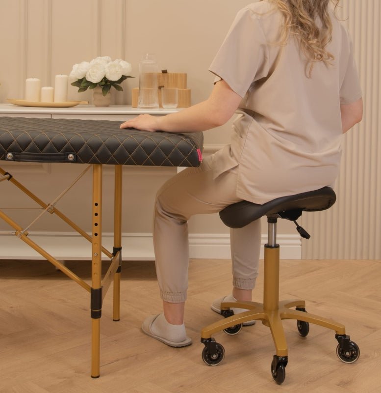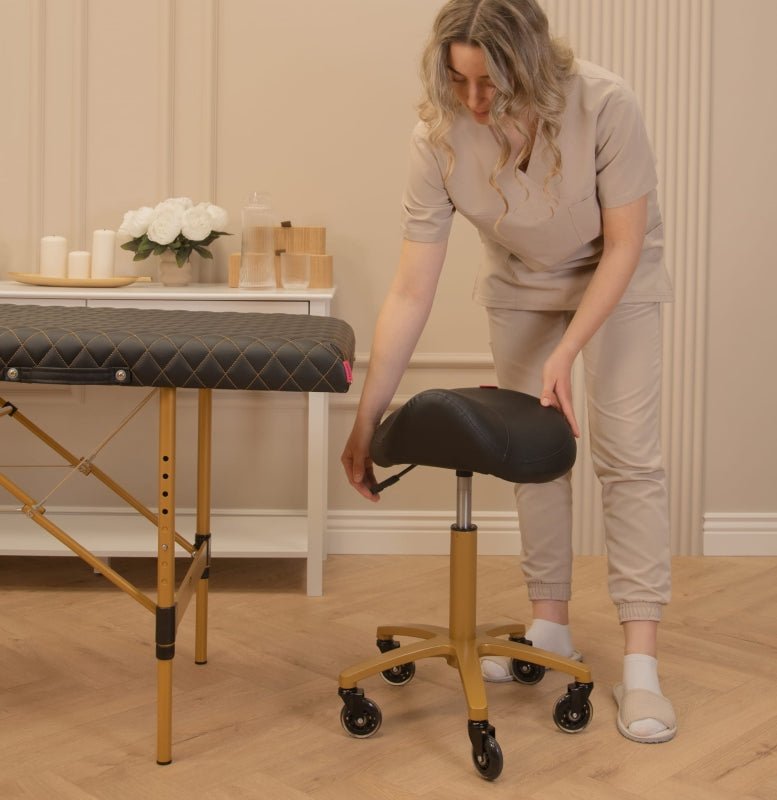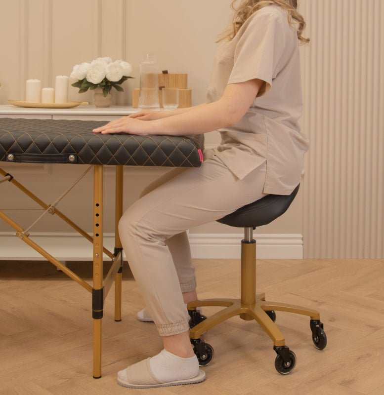 This cosmetic stool is an ergonomic and elegant solution for professional beauty salons, hairdressers, and tattoo studios. Its specially contoured seat promotes proper posture while working, reducing fatigue and discomfort even during long-lasting treatments.