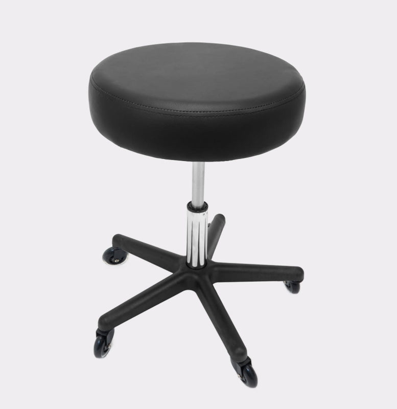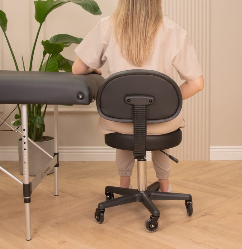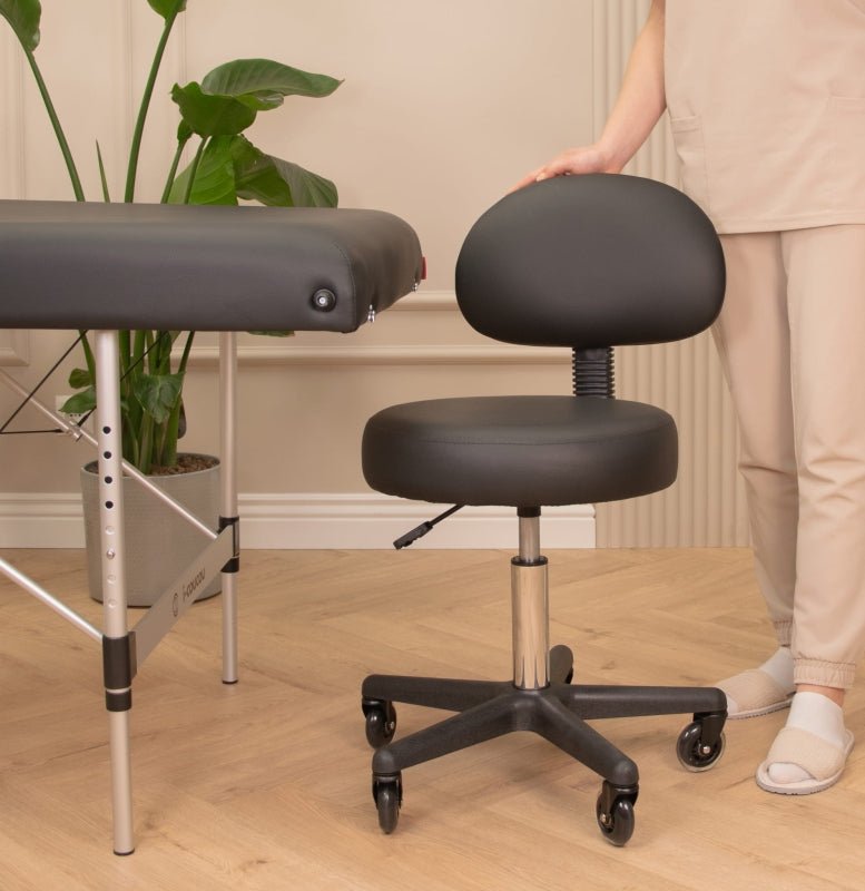 Krzesło kosmetyczne z oparciem to mebel, który łączy w sobie funkcjonalność, wygodę i elegancki wygląd. Dzięki wyjątkowo szerokiemu siedzisku o wymiarze aż 40 cm oraz 8-centymetrowej warstwie pianki tapicerskiej, zapewnia komfort nawet podczas długich godzin pracy. Tapicerka z wysokiej jakości ekoskóry z ozdobnymi przeszyciami nie tylko prezentuje się stylowo, ale jest też łatwa do utrzymania w czystości – odporna na detergenty, oleje i wodę, co pozwala zachować najwyższe standardy higieny w gabinecie. Obracane, gumowe kółka ułatwiają mobilność i swobodne poruszanie się bez konieczności wstawania.