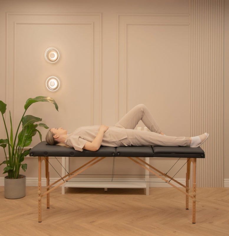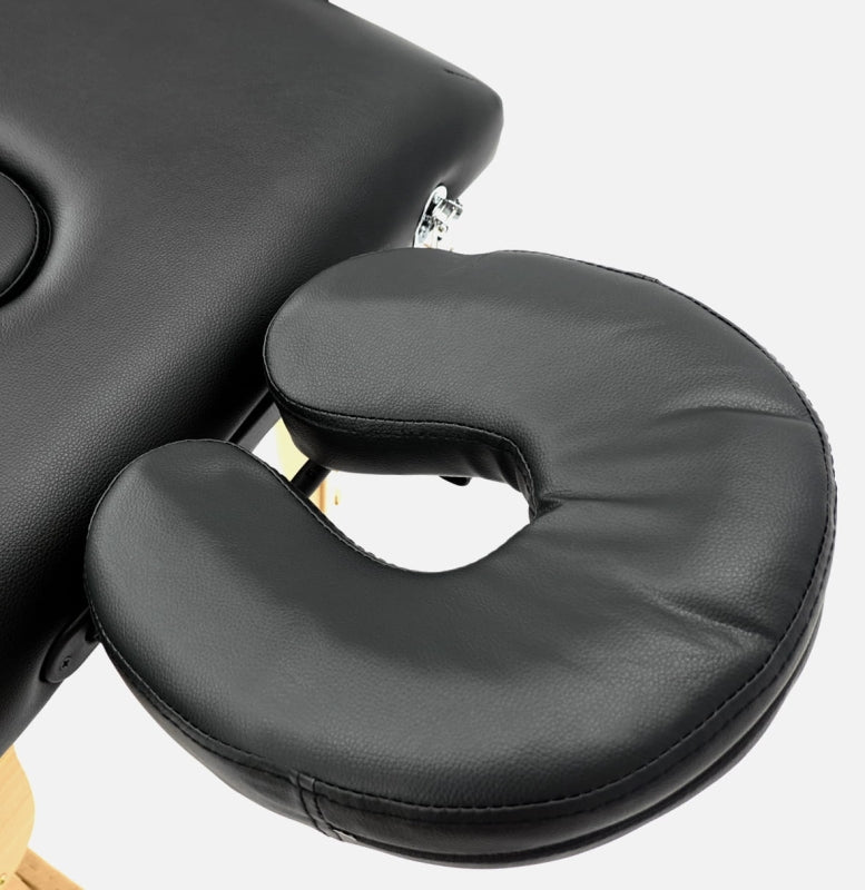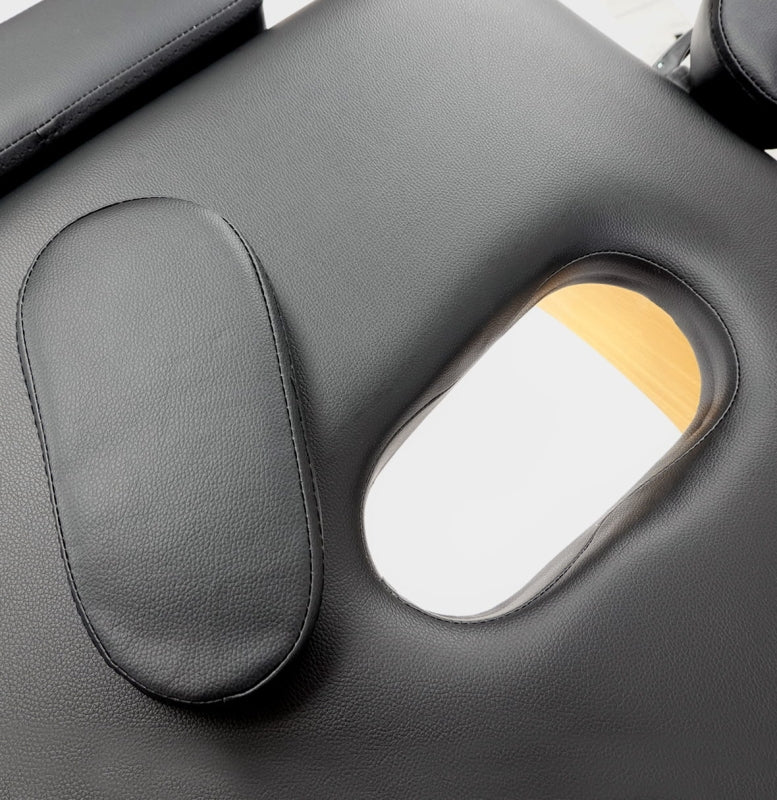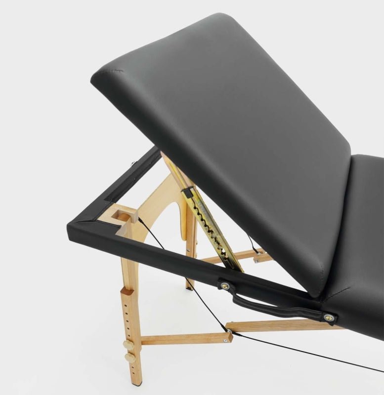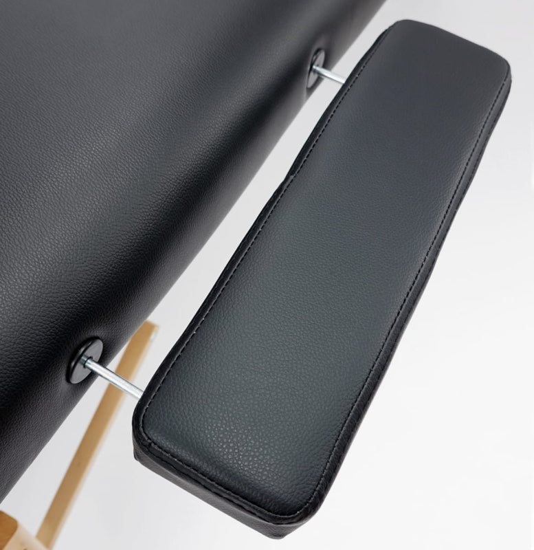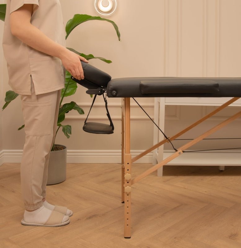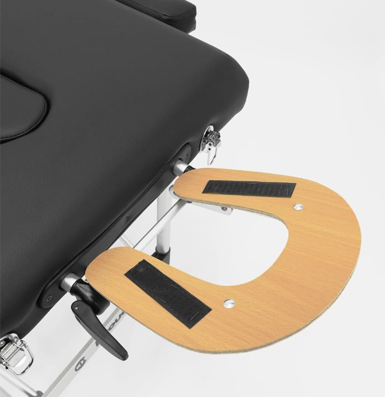 Dzięki prostej regulacji wysokości w zakresie od 62 do 87 cm, każdy specjalista może szybko dopasować stół do własnych potrzeb i zapewnić klientowi maksymalny komfort. Model wyposażony jest w regulowany zagłówek z maskowanym otworem na twarz oraz w dodatkowy, trzeci segment z możliwością 10-stopniowej regulacji, co pozwala ustawić łóżko także w pozycji siedzącej. System stalowych linek umożliwia sprawne składanie i rozkładanie stołu, a dodatkowe wzmocnienia zwiększają jego stabilność. W zestawie znajdują się boczne i przedni podłokietnik, regulowany zagłówek, torba transportowa oraz jednorazowe prześcieradło. To funkcjonalne i wygodne łóżko, które łączy mobilność z profesjonalnym designem.
