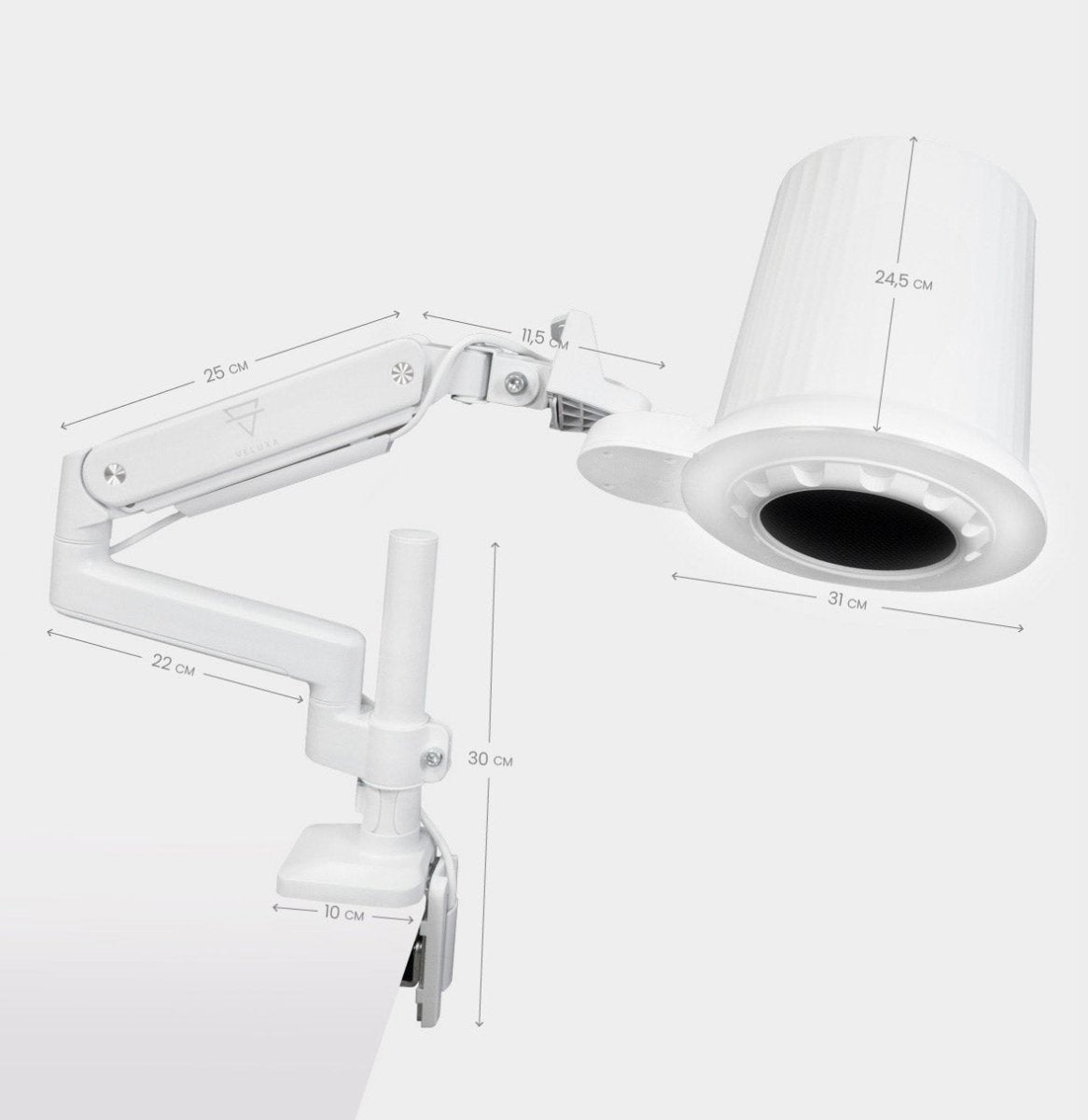 The stable, adjustable absorber stand is attached with a clamp and its adjustment involves increasing or decreasing the arm's reach and changing the head angle, in accordance with the dimensions of the workstation.